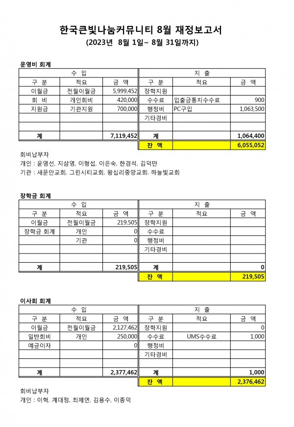 큰빛나눔커뮤니티 8월 재정보고
