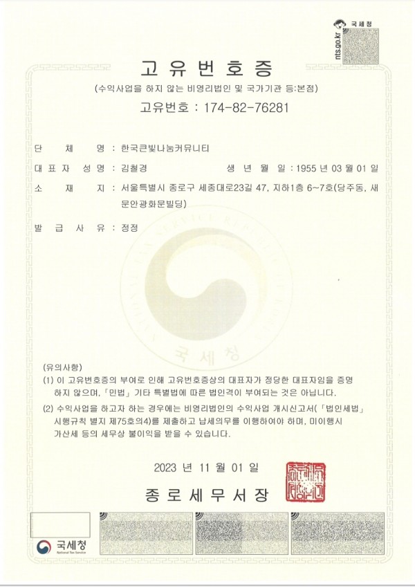 커뮤니티 사무실 주소가 기존 성동세무서 관할에서 종로세무서 관할로 변경되어 큰빛나눔커뮤니티 고유번호증을 새로 발급받았습니다.