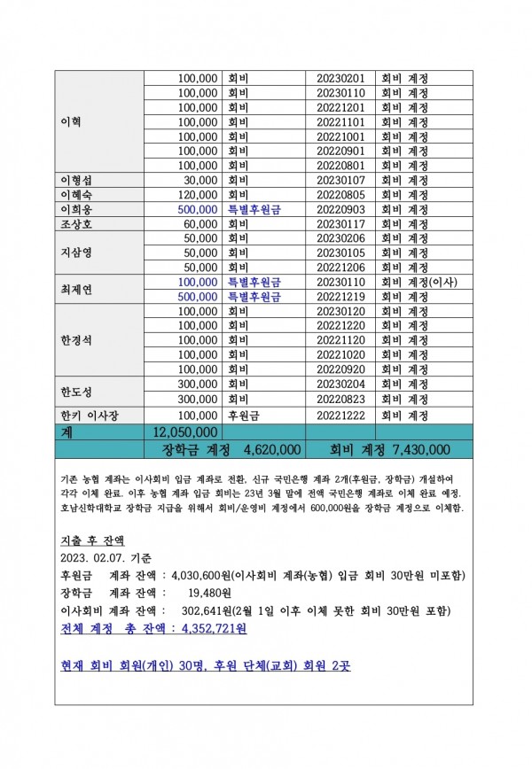 회비 입금 내역 23.2.7 기준 > 기부금 내역