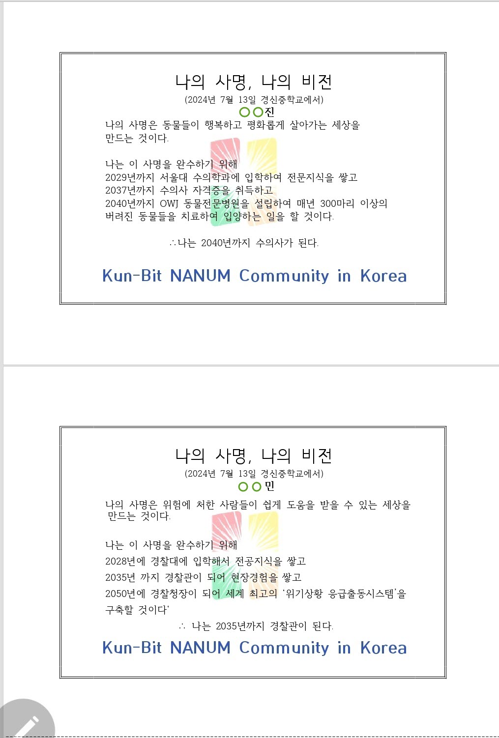청소년 리더십아카데미 강좌 수료증 및 나의 사명, 나의 비젼