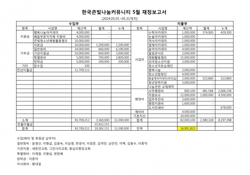 한국큰빛나눔커뮤니티 5월 재정보고서