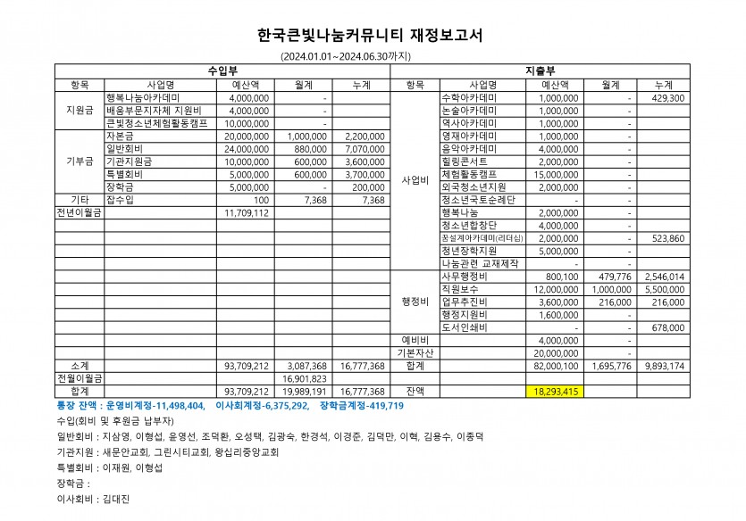 큰빛나눔커뮤니티 2024년 6월 재정보고서